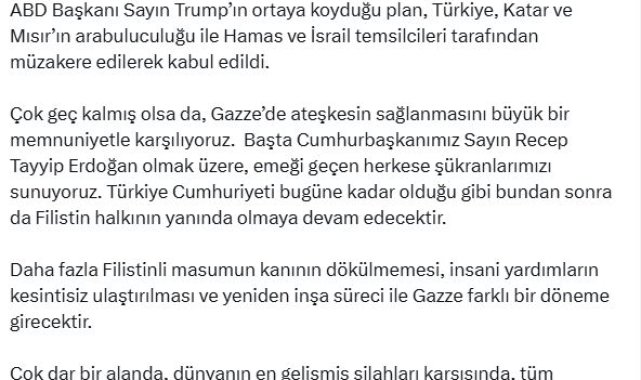 CUMHURBAŞKANI Yardımcısı Cevdet Yılmaz, "Çok geç kalmış olsa da Gazze'de ateşkesin sağlanmasını büyük bir memnuniyetle karşılıyoruz" dedi.Cumhurbaşkanı Yardımcısı Cevdet Yılmaz, Gazze'de sağlanan ateşkese ilişkin sosyal medya hesabından açıklama yaptı. Yılmaz, "ABD Başkanı Sayın Trump'ın ortaya koyduğu plan, Türkiye, Katar ve Mısır'ın ara buluculuğu ile Hamas ve İsrail temsilcileri tarafından müzakere edilerek kabul edildi. Çok geç kalmış olsa da Gazze'de ateşkesin sağlanmasını büyük bir memnuniyetle karşılıyoruz. Başta Cumhurbaşkanımız Sayın Recep Tayyip Erdoğan olmak üzere, emeği geçen herkese şükranlarımızı sunuyoruz. Türkiye Cumhuriyeti bugüne kadar olduğu gibi bundan sonra da Filistin halkının yanında olmaya devam edecektir. Daha fazla Filistinli masumun kanının dökülmemesi, insani yardımların kesintisiz ulaştırılması ve yeniden inşa süreci ile Gazze farklı bir döneme girecektir. Çok dar bir alanda, dünyanın en gelişmiş silahları karşısında, tüm imkansızlıklar içinde büyük bir direniş gösteren Gazze halkını gönülden selamlıyoruz" ifadelerini kullandı.'SUMUD RUHU, UMUDUNUN GÜÇLENMESİNE VESİLE OLDU'Gazze'nin direnişine dikkat çeken Cevdet Yılmaz, "İki yıldır süren insanlık dışı saldırılara rağmen Filistin halkı toprağından sökülüp atılamadı. Birçok ülke Filistin devletini resmen tanıdı. Gazze'nin direnişi tüm dünyada uyanışa vesile oldu. Gazze'de işgale, ablukaya ve soykırıma direniş, insanlığın ve insani değerlerin dirilişine dönüştü. Bu uyanış etrafında oluşan insanlık ittifakı ve Sumud ruhu daha adaletli bir dünya umudunun güçlenmesine vesile oldu. Önümüzdeki dönem tarafların varılan anlaşmaya sadık kalmasını ve etkili şekilde uygulamalarını bekliyoruz. Anlaşmaya katkı sunduğumuz gibi uygulanmasını da yakından takip ederek sürece katkı sunacağız. Bu sürecin sonunda işgalin tamamen sona ermesi ve 1967 sınırlarında başkenti Doğu Kudüs olan Filistin devletinin hayat bulması; herkes için güvenliği, huzuru ve barışı kalıcı hale getirecektir" dedi.