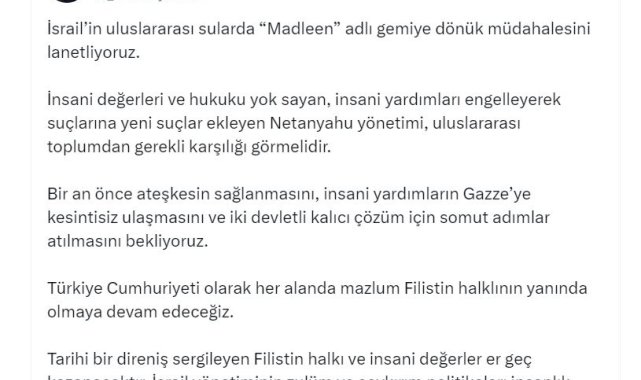 ANKARA, (DHA)- CUMHURBAŞKANI Yardımcısı Cevdet Yılmaz, "İsrail'in uluslararası sularda 'Madleen' adlı gemiye dönük müdahalesini lanetliyoruz