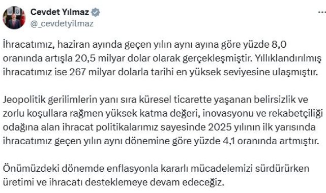 Cumhurbaşkanı Yardımcısı Cevdet Yılmaz, sosyal medya hesabından yaptığı açıklamada, "İhracatımız, haziran ayında geçen yılın aynı ayına göre yüzde 8 oranında artışla 20,5 milyar dolar olarak gerçekleşmiştir. Yıllıklandırılmış ihracatımız ise 267 milyar dolarla tarihi en yüksek seviyesine ulaşmıştır. Jeopolitik gerilimlerin yanı sıra küresel ticarette yaşanan belirsizlik ve zorlu koşullara rağmen yüksek katma değeri, inovasyonu ve rekabetçiliği odağına alan ihracat politikalarımız sayesinde 2025 yılının ilk yarısında ihracatımız geçen yılın aynı dönemine göre yüzde 4,1 oranında artmıştır. Önümüzdeki dönemde enflasyonla kararlı mücadelemizi sürdürürken üretimi ve ihracatı desteklemeye devam edeceğiz" ifadelerini kullandı.