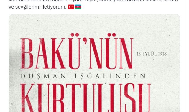 Cumhurbaşkanı Erdoğan, sosyal medya hesabından yayımladığı mesajda, "Can Azerbaycan'ın başkenti Bakü'nün düşman işgalinden kurtuluş yıl dönümünü en kalbi duygularımla tebrik ediyorum. Kafkas İslam Ordusu Komutanı Nuri Killigil Paşa'yı ve tüm kahramanlarımızı rahmetle yad ediyor, kardeş Azerbaycan halkına selam ve sevgilerimi iletiyorum" ifadelerini kullandı.