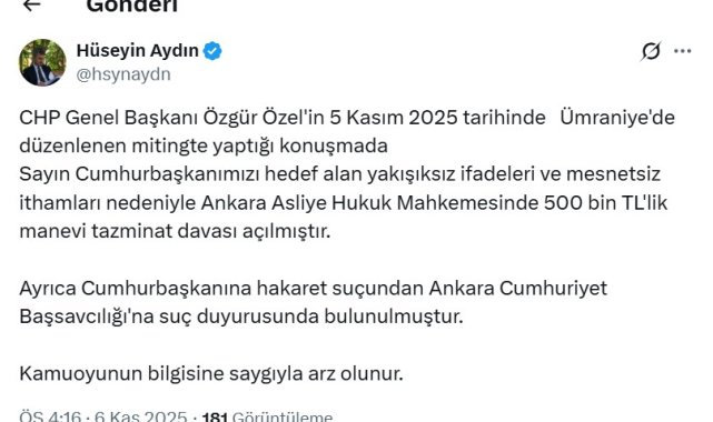 CUMHURBAŞKANI Recep Tayyip Erdoğan, CHP Genel Başkanı Özgür Özel hakkında, Ümraniye'de düzenlenen mitingde kendisine yönelik ifadeleri nedeniyle 500 bin liralık manevi tazminat davası açtı.Cumhurbaşkanı Erdoğan'ın avukatı Hüseyin Aydın, sosyal medya hesabından yaptığı açıklamada, "CHP Genel Başkanı Özgür Özel'in 5 Kasım 2025 tarihinde Ümraniye'de düzenlenen mitingde yaptığı konuşmada Sayın Cumhurbaşkanımızı hedef alan yakışıksız ifadeleri ve mesnetsiz ithamları nedeniyle Ankara Asliye Hukuk Mahkemesinde 500 bin TL'lik manevi tazminat davası açılmıştır. Ayrıca Cumhurbaşkanına hakaret suçundan Ankara Cumhuriyet Başsavcılığı'na suç duyurusunda bulunulmuştur" ifadelerini kullandı.