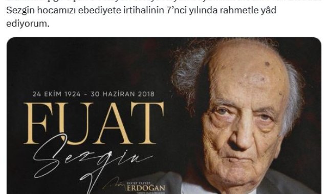 CUMHURBAŞKANI Recep Tayyip Erdoğan, Prof. Dr. Fuat Sezgin'i vefatının 7'nci yılında andı. Cumhurbaşkanı Erdoğan, sosyal medya hesabından yaptığı paylaşımda, "Yaptığı çalışmalarla, kaleme aldığı eserlerle İslam, bilim ve teknoloji alanında çığır açan bir vizyon ortaya koyan büyük ilim insanı Prof. Dr. Fuat Sezgin hocamızı ebediyete irtihalinin 7'nci yılında rahmetle yad ediyorum" ifadelerini kullandı.