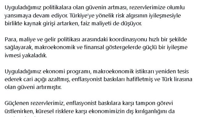 Uyguladıkları ekonomi programının, makroekonomik istikrarı yeniden tesis ederek cari açığı azalttığını aktaran Yılmaz, "Enflasyonist baskıları hafifletmiş ve Türk lirasına olan güveni artırmıştır. Güçlenen rezervlerimiz, enflasyonist baskılara karşı tampon görevi üstlenirken, küresel risklere karşı ekonomimizin dış kırılganlığını da azaltmaktadır. Enflasyonla kararlı bir şekilde mücadele ederken, dengeli ve kapsayıcı büyüme ile kalıcı refah artışını hedefleyen programımız, bütüncül politikalarla sürdürülecektir" açıklamasında bulundu.