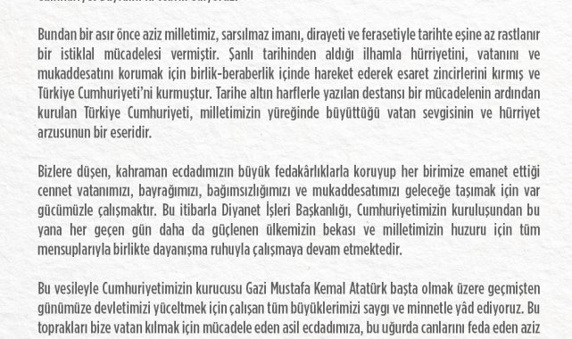 ANKARA, (DHA)- DİYANET İşleri Başkanlığı, '29 Ekim Cumhuriyet Bayramı' nedeniyle mesaj yayımladı