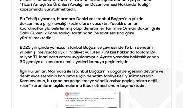 DMM'nin sosyal medya hesabından yapılan açıklamada, "Bazı basın yayın organlarında yer alan, 'İstanbul Boğazı'nda onlarca gırgır teknesi göç eden balıkların önünü kesiyor, balık soykırımı yaşanıyor' yönündeki iddialar tamamen asılsız olup, kamuoyunu yanıltmaya yönelik dezenformasyon içermektedir. Türkiye'de denizlerde yapılan tüm balıkçılık faaliyetleri, 1380 sayılı Su Ürünleri Kanunu ve Tarım ve Orman Bakanlığı tarafından yayımlanan 'Ticari Amaçlı Su Ürünleri Avcılığının Düzenlenmesi Hakkında Tebliğ' kapsamında yürütülmektedir. Bu tebliğ uyarınca, Marmara Denizi ve İstanbul Boğazı'nın yüzde 90'ında gırgır avcılığı kesin olarak yasaktır. Yasaklı alanlar koordinatlarıyla belirlenmiş olup, denetimler Tarım ve Orman Bakanlığı ile Sahil Güvenlik Komutanlığı tarafından 24 saat esasına göre yürütülmektedir. 2025 yılı içinde yalnızca İstanbul Boğazı ve çevresinde 15 bin denetim yapılmış; mevzuata aykırı faaliyet yürüten 769 kişi hakkında toplam 24 milyon TL idari para cezası uygulanmıştır. Ayrıca yasa dışı balıkçılık yapan 20 gemiye el konularak mülkiyetleri kamuya geçirilmiştir. İlgili kurumlar, Marmara ile İstanbul Boğazı'nın doğal dengesinin devamı ve deniz ekosisteminin korunması için denetim faaliyetleri yürütmektedir. Kamuoyunun, bu çabaları gölgelemeye yönelik asılsız paylaşımlara değil, resmi kurumların açıklamalarına itibar etmesi önem taşımaktadır" ifadelerine yer verildi.