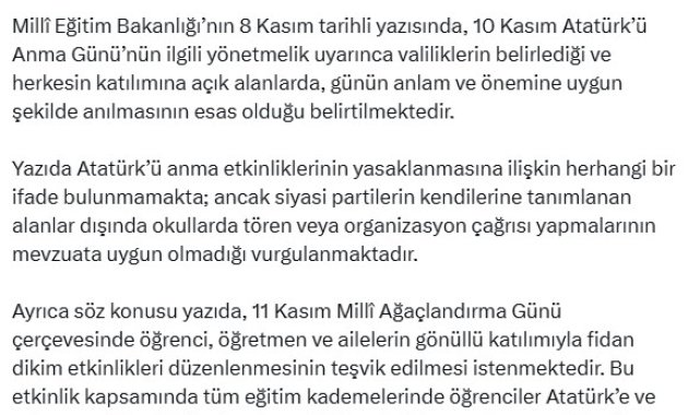 DEZENFORMASYONLA Mücadele Merkezi (DMM) Milli Eğitim Bakanlığı'nın 10 Kasım'da okullarda Atatürk'ü anmayı yasakladığı ve 'kapıları kilitleyin' talimatı verdiği iddialarının dezenformasyon içerdiğini bildirdi.DMM'den yapılan açıklamada, "Milli Eğitim Bakanlığı'nın 8 Kasım tarihli yazısında, 10 Kasım Atatürk'ü Anma Günü'nün ilgili yönetmelik uyarınca valiliklerin belirlediği ve herkesin katılımına açık alanlarda, günün anlam ve önemine uygun şekilde anılmasının esas olduğu belirtilmektedir. Yazıda Atatürk'ü anma etkinliklerinin yasaklanmasına ilişkin herhangi bir ifade bulunmamakta; ancak siyasi partilerin kendilerine tanımlanan alanlar dışında okullarda tören veya organizasyon çağrısı yapmalarının mevzuata uygun olmadığı vurgulanmaktadır. Ayrıca söz konusu yazıda, 11 Kasım Milli Ağaçlandırma Günü çerçevesinde öğrenci, öğretmen ve ailelerin gönüllü katılımıyla fidan dikim etkinlikleri düzenlenmesinin teşvik edilmesi istenmektedir. Bu etkinlik kapsamında tüm eğitim kademelerinde öğrenciler Atatürk'e ve vatan sevgisine ilişkin duygu ve düşüncelerini yansıtan mesaj kartları hazırlayarak diktikleri fidanlara yerleştireceklerdir. Milli Eğitim Bakanlığı, bugün ve yarın okullarda gönüllülük esasına göre Atatürk'ü anmaya yönelik faaliyetlerin sürdüğünü bildirmektedir. Kamuoyunun, manipülatif amaçlarla yayılan asılsız içeriklere itibar etmemesi önemle rica olunur" denildi.