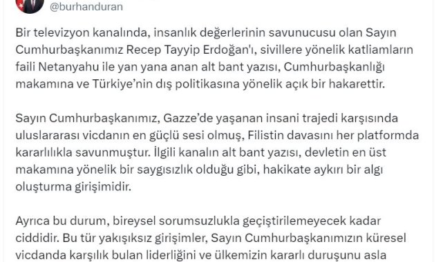 İletişim Başkanı Duran, sosyal medya hesabından yaptığı açıklamada, "Bir televizyon kanalında, insanlık değerlerinin savunucusu olan Sayın Cumhurbaşkanımız Recep Tayyip Erdoğan'ı, sivillere yönelik katliamların faili Netanyahu ile yan yana anan alt bant yazısı, Cumhurbaşkanlığı makamına ve Türkiye'nin dış politikasına yönelik açık bir hakarettir. Sayın Cumhurbaşkanımız, Gazze'de yaşanan insani trajedi karşısında uluslararası vicdanın en güçlü sesi olmuş, Filistin davasını her platformda kararlılıkla savunmuştur. İlgili kanalın alt bant yazısı, devletin en üst makamına yönelik bir saygısızlık olduğu gibi, hakikate aykırı bir algı oluşturma girişimidir. Ayrıca bu durum, bireysel sorumsuzlukla geçiştirilemeyecek kadar ciddidir. Bu tür yakışıksız girişimler, Sayın Cumhurbaşkanımızın küresel vicdanda karşılık bulan liderliğini ve ülkemizin kararlı duruşunu asla gölgeleyemeyecektir" dedi.