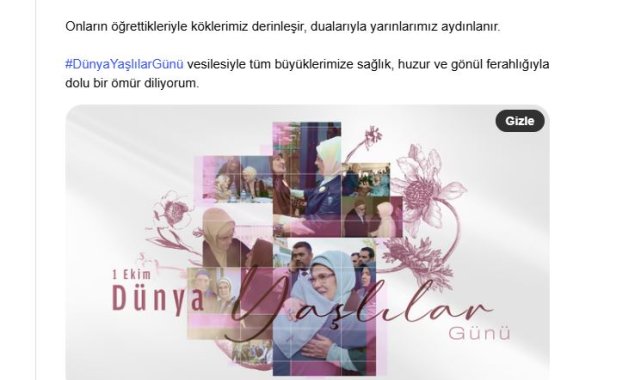 ANKARA, (DHA)- CUMHURBAŞKANI Recep Tayyip Erdoğan'ın eşi Emine Erdoğan, 1 Ekim Dünya Yaşlılar Günü dolayısıyla paylaşımda bulundu