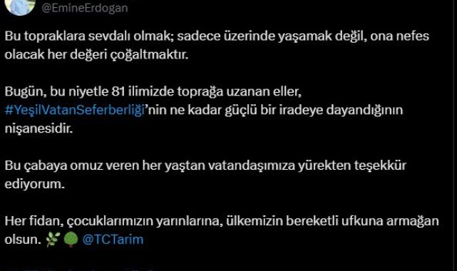 CUMHURBAŞKANI Recep Tayyip Erdoğan'ın eşi Emine Erdoğan, 11 Kasım Milli Ağaçlandırma Günü mesajında, "Her fidan, çocuklarımızın yarınlarına, ülkemizin bereketli ufkuna armağan olsun" dedi.Emine Erdoğan, sosyal medya hesabından yaptığı paylaşımda, "Bu topraklara sevdalı olmak; sadece üzerinde yaşamak değil, ona nefes olacak her değeri çoğaltmaktır. Bugün, bu niyetle 81 ilimizde toprağa uzanan eller, 'Yeşil Vatan Seferberliği'nin ne kadar güçlü bir iradeye dayandığının nişanesidir. Bu çabaya omuz veren her yaştan vatandaşımıza yürekten teşekkür ediyorum. Her fidan, çocuklarımızın yarınlarına, ülkemizin bereketli ufkuna armağan olsun" dedi.