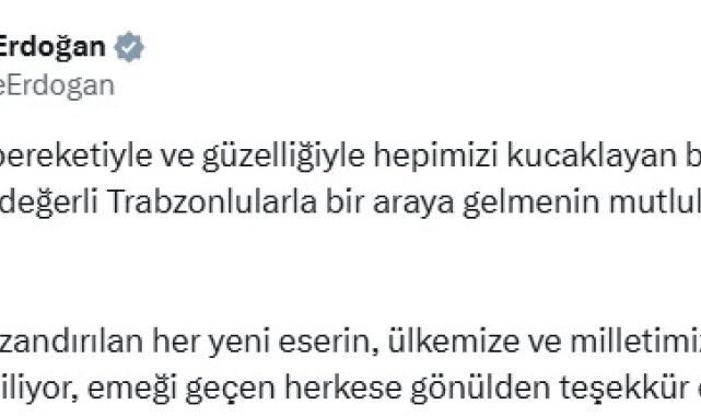 CUMHURBAŞKANI Recep Tayyip Erdoğan'ın eşi Emine Erdoğan, Trabzon ziyaretiyle ilgili sosyal medya hesabından paylaşımda bulundu.Trabzon'a, yapımı tamamlanan tesis ve projelerin açılış töreni için giden Cumhurbaşkanı Erdoğan'a eşlik eden Emine Erdoğan, sosyal medya hesabından yaptığı paylaşımda, "Trabzon'da, bereketiyle ve güzelliğiyle hepimizi kucaklayan bu topraklarda, değerli Trabzonlularla bir araya gelmenin mutluluğunu yaşadık. Şehrimize kazandırılan her yeni eserin, ülkemize ve milletimize hayırlar getirmesini diliyor, emeği geçen herkese gönülden teşekkür ediyorum" dedi.
