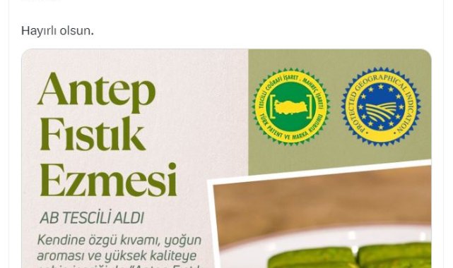 Bakan Yumaklı, sosyal medya hesabından yaptığı açıklamada, "Fıstık gibi müjde. Antep fıstık ezmesi, Avrupa Birliği'nden coğrafi işaret tescili alan 36'ncı ürünümüz oldu. Gaziantep'in eşsiz ezmesi, Avrupa sofralarında da hak ettiği yeri alacak. Hayırlı olsun" dedi.