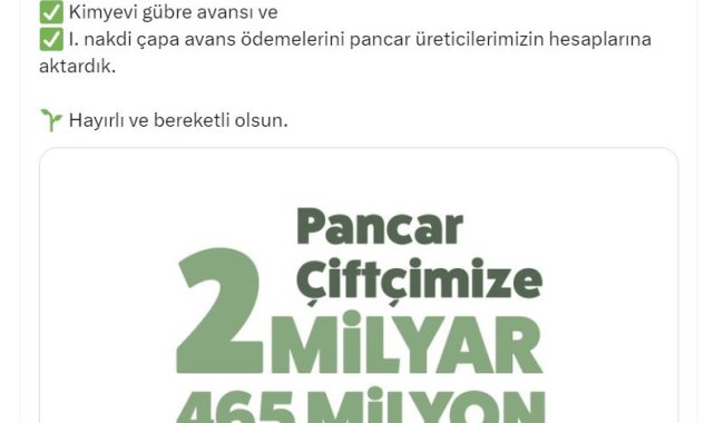 ANKARA, (DHA)- TARIM ve Orman Bakanı İbrahim Yumaklı, Türkşeker aracılığıyla toplamda 2 milyar 465 milyon TL olmak üzere; kimyevi gübre avansı ve 1'inci nakdi çapa avans ödemelerinin pancar üreticilerinin hesaplarına aktarıldığını duyurdu