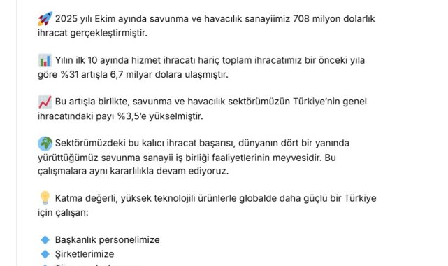 Savunma Sanayii Başkanı Görgün, 2025 yılı ekim ayı ihracat verilerine ilişkin NSosyal hesabından açıklama yaptı. Görgün, "2025 yılı ekim ayında savunma ve havacılık sanayimiz 708 milyon dolarlık ihracat gerçekleştirmiştir. Yılın ilk 10 ayında hizmet ihracatı hariç toplam ihracatımız bir önceki yıla göre yüzde 31 artışla 6,7 milyar dolara ulaşmıştır. Bu artışla birlikte, savunma ve havacılık sektörümüzün Türkiye'nin genel ihracatındaki payı yüzde 3,5'e yükselmiştir. Sektörümüzdeki bu kalıcı ihracat başarısı, dünyanın dört bir yanında yürüttüğümüz savunma sanayi iş birliği faaliyetlerinin meyvesidir. Bu çalışmalara aynı kararlılıkla devam ediyoruz. Katma değerli, yüksek teknolojili ürünlerle globalde daha güçlü bir Türkiye için çalışan başkanlık personelimize, şirketlerimize ve tüm paydaşlarımıza teşekkür ediyor, başarılarının devamını diliyorum" ifadelerini kullandı.