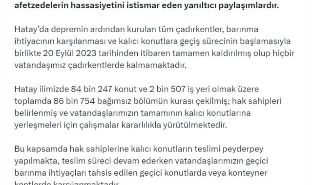 DMM'nin sosyal medya hesabından yapılan açıklamada, "Çeşitli sosyal medya hesaplarında 'Hatay'da hala çadırda kalan depremzedeler var' şeklinde paylaşılan içerikler, gerçeği yansıtmayan, kamuoyunda yanlış algı oluşturmayı amaçlayan ve afetzedelerin hassasiyetini istismar eden yanıltıcı paylaşımlardır. Hatay'da depremin ardından kurulan tüm çadır kentler, barınma ihtiyacının karşılanması ve kalıcı konutlara geçiş sürecinin başlamasıyla birlikte 20 Eylül 2023 tarihinden itibaren tamamen kaldırılmış olup hiçbir vatandaşımız çadır kentlerde kalmamaktadır. Hatay ilimizde 84 bin 247 konut ve 2 bin 507 iş yeri olmak üzere toplamda 86 bin 754 bağımsız bölümün kurası çekilmiş; hak sahipleri belirlenmiş ve vatandaşlarımızın tamamının kalıcı konutlarına yerleşmeleri için çalışmalar kararlılıkla yürütülmektedir" denildi.