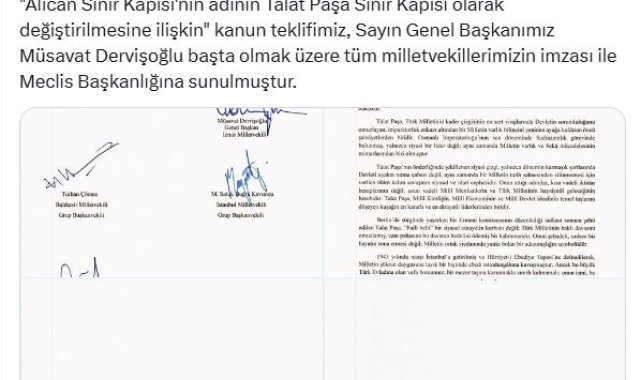 İYİ Parti TBMM grubu, Türkiye ve Ermenistan sınırındaki Alican Sınır Kapısı'nın isminin, 'Talat Paşa Sınır Kapısı' olarak değiştirilmesi için Türkiye Büyük Millet Meclisi'ne (TBMM) kanun teklifi verdi. İYİ Parti Genel Başkanı Müsavat Dervişoğlu ve 28 milletvekilinin imzasıyla TBMM Başkanlığına sunulan kanun teklifinde, "Tarih, yalnızca olup bitenlerin kaydı değildir; aynı zamanda milletlerin kimliğini inşa eden, hafızasını diri tutan ve gelecek nesillere aktarılan büyük mücadelelerin, büyük liderlerin ve büyük fikirlerin mirasıdır. Bu mirası yaşatmak, devlet aklının olduğu kadar, millet vicdanının da en temel sorumluluğudur. İşte bu sorumluluğun bir gereği olarak; önemli sınır kapılarımızdan biri olan Alican Sınır Kapısı'nın, 'Talat Paşa Sınır Kapısı' olarak yeniden adlandırılması, tarihimize, bağımsızlık mücadelemize ve milli hafızamıza sahip çıkma iradesinin somut bir tezahürü olacaktır. Talat Paşa, Türk milletinin kader çizgisinin en sert virajlarında Devletin sorumluluğunu omuzlayan, imparatorluk enkazı altından bir milletin varlık bilincini yeniden ayağa kaldıran öncü şahsiyetlerden biridir. Osmanlı İmparatorluğu'nun son döneminde sadrazamlık görevinde bulunmuş, yalnızca siyasi bir lider değil; aynı zamanda milletin varlık ve beka mücadelesinin mimarlarından biri olmuştur" denildi.'SINIR KAPISININ TALAT PAŞA'NIN İSMİYLE ANILMASI SAYGI NİŞANESİDİR'Talat Paşa'nın hayat hikayesinin anlatıldığı teklifin devamında şu ifadelere yer verildi:"Bugün, Alican Sınır Kapısı'nın Talat Paşa'nın ismiyle anılması, coğrafyamıza kazınacak bir saygı nişanesidir. Bu değişiklik, yalnızca bir tabelanın değiştirilmesi değil; Türk milletinin kendi tarihine, kendi kahramanlarına ve kendi hafızasına sahip çıkma iradesinin güçlü bir beyanıdır. Çünkü Milli kahramanlarını unutan milletler, zamanla kendilerini de unutur. Alican Sınır Kapısı'nın adının değiştirilerek Talat Paşa'nın isminin verilmesi, aynı zamanda düşman karşısında dimdik duran bir milletin, sınırlarına kendi tarihi kimliğini mühürlemesidir. Bu adım, hem milletimizin genç kuşaklarına tarih şuuru kazandırmak, hem de devletimizin tarihi sürekliliğini ve onurlu geçmişini hatırlatmak adına büyük bir anlam taşımaktadır. Bu vesileyle, Talat Paşa'nın adını devletimizin stratejik ve sembolik önemi büyük olan bir sınır kapısında yaşatmak; onun ideallerine, mücadelesine ve fedakârlıklarına layık bir selam olacaktır."