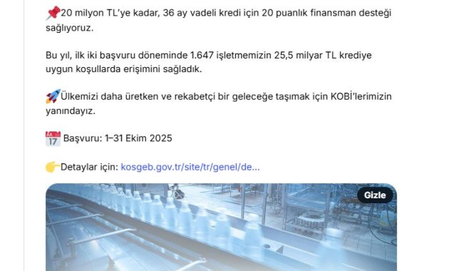 Sanayi ve Teknoloji Bakanı Mehmet Fatih Kacır, NSosyal hesabından yaptığı paylaşımda, "Türkiye ekonomisinin kalbi KOBİ'lerimizi güçlendirmeye devam ediyoruz. KOSGEB Kapasite Geliştirme Destek Programı'nda bu yılın 3'üncü başvuru dönemini açıyoruz. 20 milyon TL'ye kadar, 36 ay vadeli kredi için 20 puanlık finansman desteği sağlıyoruz. Bu yıl, ilk 2 başvuru döneminde 1647 işletmemizin 25,5 milyar TL krediye uygun koşullarda erişimini sağladık. Ülkemizi daha üretken ve rekabetçi bir geleceğe taşımak için KOBİ'lerimizin yanındayız. Başvuru; 1-31 Ekim 2025" ifadelerine yer verdi.