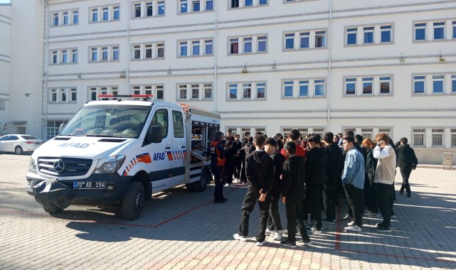 Karaman Anadolu Lisesi öğrencileri, AFAD eğitmenleri tarafından verilen afet farkındalık eğitimi ve tatbikatına katıldı. Eğitimde çök-kapan-tutun uygulaması ve tahliye tatbikatı yapıldı.