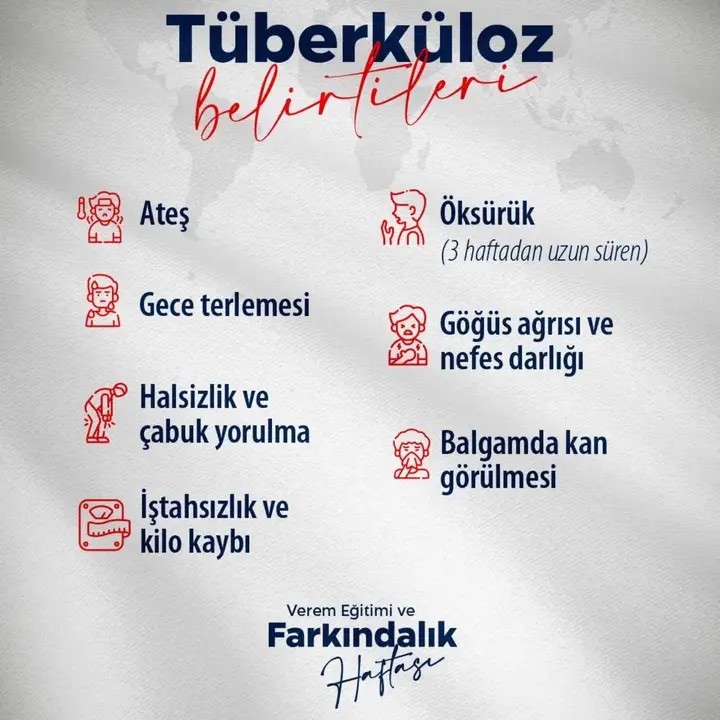 Açıklamada, Türkiye'nin Ulusal Tüberküloz Kontrol Programı ile bu mücadelede örnek ülkeler arasında yer aldığı ifade edildi. Bu program kapsamında, tanı, tedavi ve takip hizmetlerinin verem savaşı dispanserlerinde ücretsiz olarak sunulduğu ve hastaların tedavi süreçlerinin kesintisiz yönetildiği hatırlatıldı.Tüberküloz Nasıl Bulaşıyor, Belirtileri Neler?