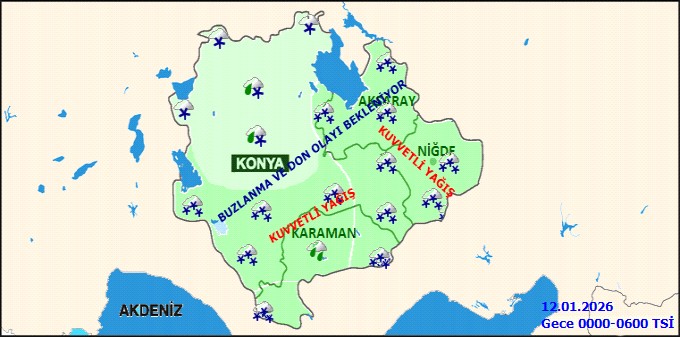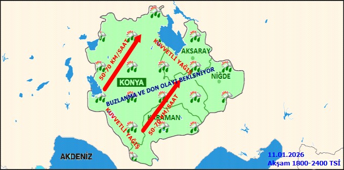 MGM Karaman Hava Durumu tarafından iki önemli uyarı yapıldı:1. Kuvvetli Rüzgar Uyarısı: Karaman'da güney ve güneybatı yönlerden kuvvetli rüzgâr ve fırtına (50-80 km/saat, yükseklerde yer yer 80-90 km/saat) bekleniyor. Bu durumun ulaşımda aksamalara, çatı uçmasına, soba ve doğalgaz kaynaklı zehirlenmelere, kar örtüsü olan bölgelerde ise tipi gibi olumsuzluklara yol açabileceği belirtildi.2. Kuvvetli Kar Yağışı Uyarısı: 11 Ocak Pazar akşam saatlerinden itibaren Karaman'ın güney ve doğu ilçelerinde (Başyayla, Sarıveliler, Ayrancı ve Ermenek) ile Konya'nın güney ilçelerinde kuvvetli (5-20 cm) kar yağışı bekleniyor. Yağışların Salı günü öğle saatlerine kadar etkili olacağı tahmin ediliyor. Vatandaşların ulaşımda aksamalar, buzlanma ve don riski nedeniyle dikkatli ve tedbirli olmaları gerektiği vurgulandı.Editör: Haber MerkeziKaynak: Sosyal Medya