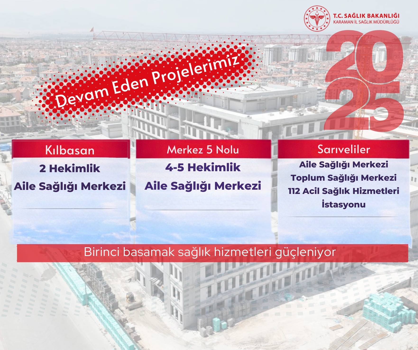 Açıklamada ayrıca, birinci basamak sağlık hizmetlerinin güçlendirilmesine yönelik projelerin de sürdüğü ifade edildi. Bu kapsamda, Aile Sağlığı Merkezleri, Toplum Sağlığı Merkezleri ve 112 acil sağlık hizmeti istasyonlarına yönelik projelerle vatandaşlara daha erişilebilir ve nitelikli hizmet sunulması hedefleniyor. Karaman İl Sağlık Müdürlüğü, sağlıklı bir Karaman için çalışmaların aralıksız devam edeceğini kaydetti.Editör: Haber MerkeziKaynak: Sosyal Medya