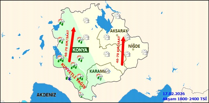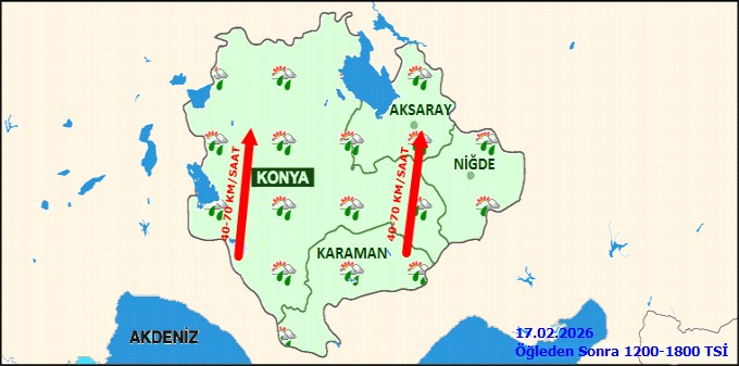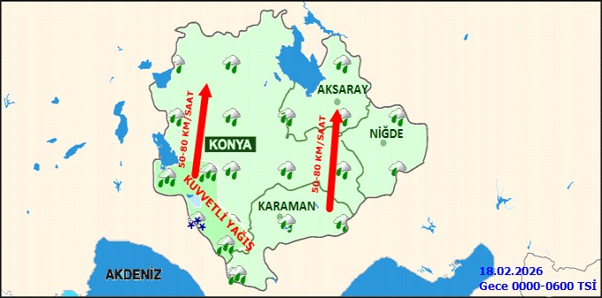 Meteoroloji yetkilileri, rüzgarın güneyli yönlerden kuvvetli ve fırtına şeklinde esmesi nedeniyle ulaşımda aksamalar, çatı uçması, soba ve doğalgaz kaynaklı zehirlenmeler ile kar örtüsü olan bölgelerde tipi gibi olumsuzluklara karşı dikkatli ve tedbirli olunması gerektiğini bildirdi. Ayrıca, Konya'nın güneybatı kesimleri için akşam saatlerinden itibaren kuvvetli sağanak ve gök gürültülü sağanak yağış uyarısı yapıldı. Bu bölgelerde Alacabel geçidi başta olmak üzere yüksek kesimlerde karla karışık yağmur ve kar yağışı beklendiği, kuvvetli yağışlarla birlikte sel, su baskını, yıldırım, ulaşımda aksamalar, yerel dolu ve yağış anında kuvvetli rüzgâr gibi olumsuzluklara karşı tedbirli olunması gerektiği vurgulandı.Editör: Haber MerkeziKaynak: Sosyal Medya