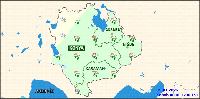 Karaman il genelinde 19 Nisan Pazar günü parçalı ve çok bulutlu bir hava hakim olacak. Gün boyunca aralıklı olarak sağanak ve gök gürültülü sağanak yağışların etkili olması bekleniyor. Merkezde en düşük sıcaklık 6, en yüksek sıcaklık ise 8 derece olarak ölçülecek.Bölge genelinde hava sıcaklıklarında 4 ila 6 derecelik bir düşüş yaşanarak mevsim normallerinin altına inmesi öngörülüyor. Rüzgarın ise kuzeyli yönlerden hafif ve orta kuvvette esmesi tahmin ediliyor. Güncel meteorolojik bir uyarı bulunmuyor.