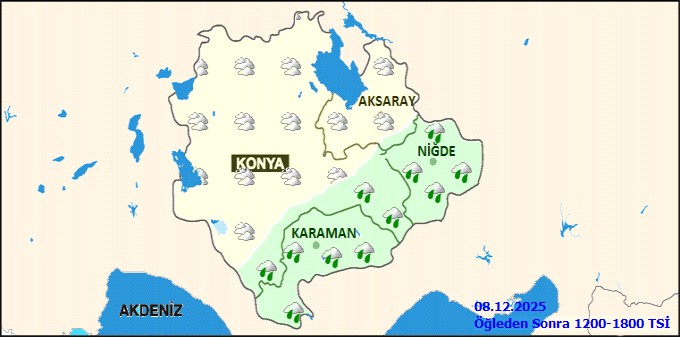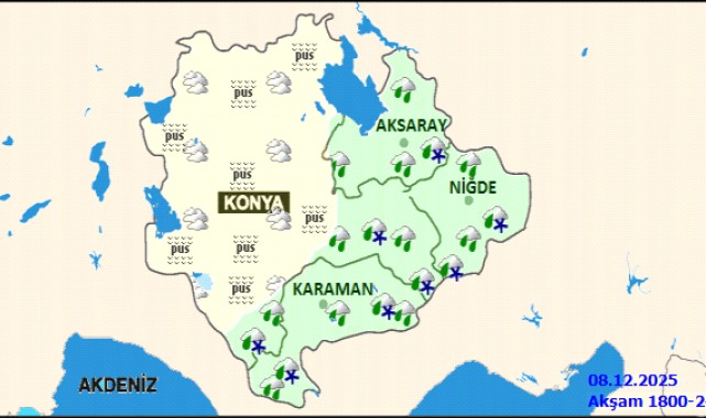 Meteoroloji Genel Müdürlüğü (MGM) Karaman Hava Durumu, 8 Aralık 2025 Pazartesi günü için Karaman ve ilçelerindeki hava tahminlerini paylaştı. Rapora göre, bölge genelinde havanın parçalı ve çok bulutlu olması bekleniyor. Karaman il merkezi ve çevresi için aralıklı yağmur öngörülürken, yüksek kesimlerde ise yer yer karla karışık yağmur ve kar yağışı görülecek.Sabah ve gece saatlerinde pus ve yer yer sisin etkili olması tahmin ediliyor. Hava sıcaklığında ise önemli bir değişiklik beklenmiyor. Rüzgarın, güney ve güneydoğu yönlerden hafif, zaman zaman orta kuvvette esmesi öngörülüyor. MGM'den Karaman için güncel bir meteorolojik uyarı bulunmuyor.İlçelere Göre Hava Tahmini: