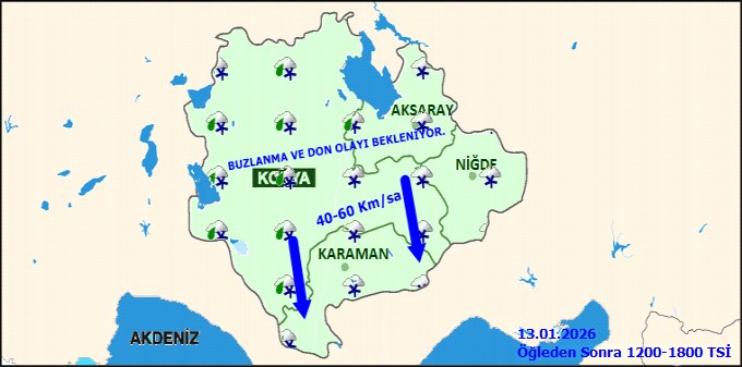 MGM Karaman Hava Durumu tarafından yayınlanan 13-17 Ocak 2026 tarihleri arasındaki hava durumu tahminleri, Karamanlıları bekleyen soğuk ve rüzgarlı bir haftaya işaret ediyor.13 Ocak Salı günü Karaman merkezde hava parçalı ve çok bulutlu olacak. Gün boyunca karla karışık yağmur ve kar yağışı bekleniyor. En düşük sıcaklık -2°C, en yüksek sıcaklık ise yalnızca 0°C olarak kaydedilecek. Bölge genelinde hava sıcaklıklarının 3 ila 5 derece azalacağı öngörülüyor.Rüzgarın etkili olacağı bu günde, rüzgar kuzeyli yönlerden hafif, ara sıra orta kuvvette esecek. Özellikle öğleden sonra rüzgarın yer yer kuvvetli (40-60 km/sa) esmesi bekleniyor.Önümüzdeki Günler Hava Nasıl Olacak?
