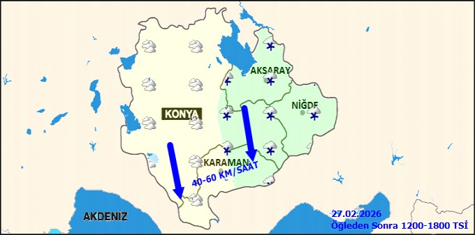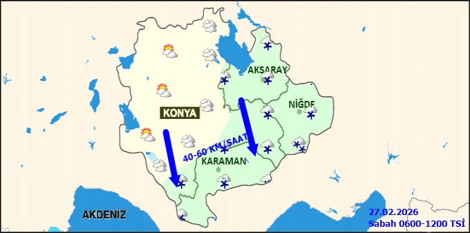 Karaman il genelinde bugün (27 Şubat Cuma) parçalı ve çok bulutlu bir hava hakim olacak. Gün içinde aralıklı kar yağışı beklenirken, en düşük sıcaklık -3, en yüksek sıcaklık ise 2 dereceye ulaşacak.Bölgesel olarak da benzer bir görünüm hakim olacak. Konya'nın doğu ve güneydoğu kesimleri ile Karaman, Aksaray ve Niğde çevrelerinde gece ve sabah saatlerinde buzlanma ve don olayı görülecek. Hava sıcaklıklarının mevsim normallerinin altında seyretmesi öngörülüyor.