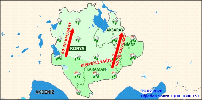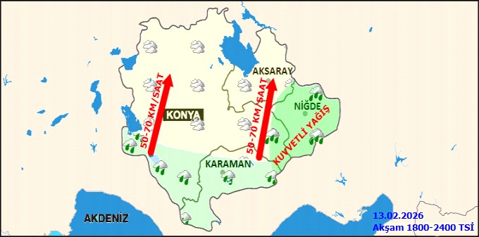 Bölgede (Konya, Karaman, Niğde ve Aksaray) güney yönlerden esecek rüzgarın yer yer kuvvetli ve fırtına şeklinde (50-80 km/saat, yer yer 90 km/saat) esmesi öngörülüyor. Fırtınanın çatı uçması, ağaç devrilmesi gibi tehlikelere neden olabileceği, ayrıca soba ve doğalgaz kaynaklı zehirlenmelere karşı da tedbirli olunması gerektiği vurgulandı.