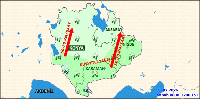 Meteoroloji'den yapılan açıklamada, Konya'nın güney ve batısı ile Karaman'ın batı kesimleri ve Niğde çevrelerinde kuvvetli ve çok kuvvetli sağanak ve gök gürültülü sağanak yağış beklendiği bildirildi. Yüksek rakımlarda karla karışık yağmur ve kar görülebileceği ifade edildi. Bu durumun sel, su baskını, yıldırım düşmesi, ulaşımda aksamalar ve yerel dolu yağışı gibi olumsuzluklara yol açabileceği uyarısı yapıldı. Ayrıca, yağış anında kuvvetli rüzgar ve fırtına beklendiği de aktarıldı.