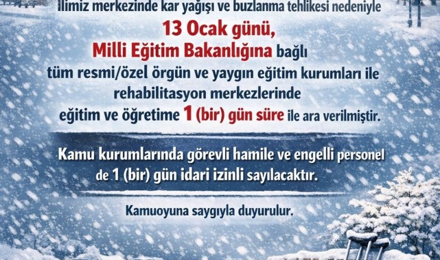 Karaman Milli Eğitim Müdürlüğü, il genelinde yaşanan kar yağışı ve özellikle artan buzlanma/don tehlikesi sebebiyle önemli bir tatil kararı aldığını duyurdu.Müdürlükten yapılan açıklamaya göre, 13 Ocak Salı günü itibarıyla Milli Eğitim Bakanlığına bağlı tüm resmi ve özel örgün ve yaygın eğitim kurumları ile rehabilitasyon merkezlerinde eğitime bir gün süreyle ara verilmesi kararlaştırıldı.Ayrıca, olumsuz hava koşullarının vatandaşlar üzerindeki etkisini azaltmak amacıyla, kamu kurumlarında görevli hamile ve engelli personel de aynı gün (1 gün) süreyle idari izinli sayılacaktır.Editör: Haber MerkeziKaynak: Sosyal Medya