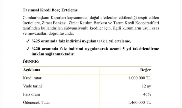 Ziraat Bankası'nın internet sitesinde yer alan bilgilere göre, doğal afetlerden zarar gören üreticiler için sübvansiyonlu tarımsal kredilerin 1 yıl süreyle ertelenmesi veya azami 5 yıl vadeyle taksitlendirilmesi mümkün hale getirilmişti. Ancak, kararname yayımlanmasından bu yana yaklaşık iki ay geçmesine rağmen yapılandırma henüz uygulamaya alınmadı. Bu durum, üretimini sürdürmeye çalışan çiftçiler için belirsizlik yaratıyor.Üretimin Sürdürülebilirliği İçin Hayati Adım