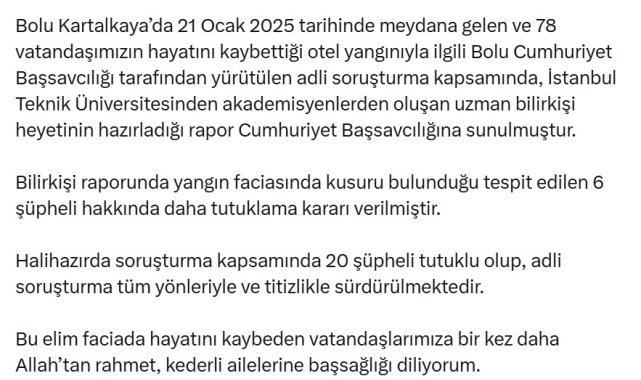 Adalet Bakanı Yılmaz Tunç, sosyal medya hesabından yaptığı açıklamada, "Bolu Kartalkaya'da 21 Ocak 2025 tarihinde meydana gelen ve 78 vatandaşımızın hayatını kaybettiği otel yangınıyla ilgili, Bolu Cumhuriyet Başsavcılığı tarafından yürütülen adli soruşturma kapsamında, İstanbul Teknik Üniversitesi'nden akademisyenlerden oluşan uzman bilirkişi heyetinin hazırladığı rapor, Cumhuriyet Başsavcılığı'na sunulmuştur. Bilirkişi raporunda yangın faciasında kusuru bulunduğu tespit edilen 6 şüpheli hakkında daha tutuklama kararı verilmiştir. Halihazırda soruşturma kapsamında 20 şüpheli tutuklu olup, adli soruşturma tüm yönleriyle ve titizlikle sürdürülmektedir. Bu elim faciada hayatını kaybeden vatandaşlarımıza bir kez daha Allah'tan rahmet, kederli ailelerine başsağlığı diliyorum" ifadelerini kullandı.