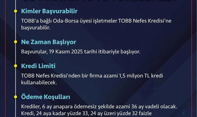 KOBİ'lere yönelik TOBB Nefes Kredisi'nin kredi hacmi 25 milyar TL'den 50 milyar TL'ye yükseltildi. Yeni kredi paketine başvurular 19 Kasım Çarşamba günü başlayacak.
