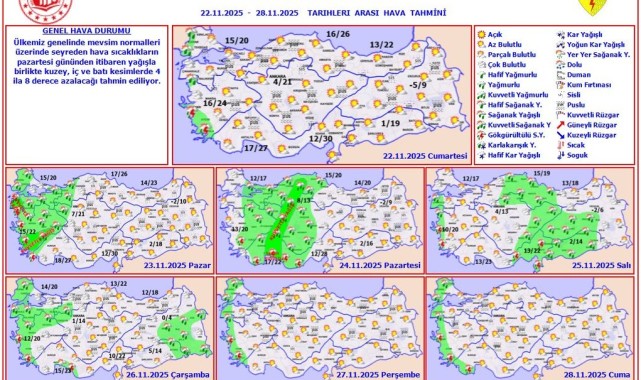 Haftalık hava tahminleri, 22 Kasım 2025 Cumartesi gününden başlayıp 28 Kasım 2025 Cuma gününe kadar olan süreci kapsıyor. Bu dönemde, özellikle yurdun kuzey, iç ve batı bölgelerinde belirgin bir serinleme yaşanması öngörülüyor.