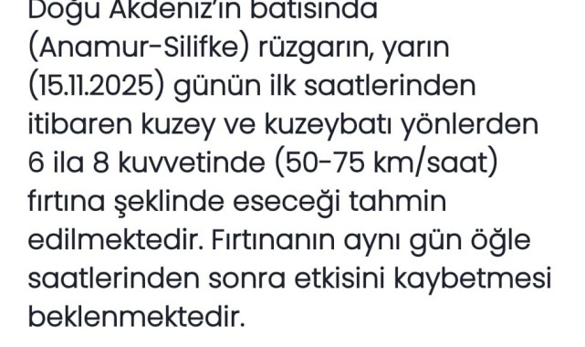 Meteoroloji Genel Müdürlüğü, 15 Kasım 2025 tarihinde Doğu Akdeniz'in batısı olan Anamur-Silifke hattında kuvvetli fırtına beklendiğini duyurdu. Fırtınanın 6 ila 8 kuvvetinde esmesi ve öğle saatlerine kadar sürmesi öngörülüyor.