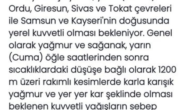 Yapılan son değerlendirmelere göre, Orta Karadeniz ve İç Anadolu'nun kuzeydoğusunda beklenen yağışların, bu gece saatlerinden itibaren etkili olmaya başlaması öngörülüyor. Yarın (Cuma) Ordu, Giresun, Sivas ve Tokat çevreleri ile Samsun ve Kayseri'nin doğusunda yerel kuvvetli yağışların görülmesi bekleniyor.Genel olarak yağmur ve sağanak şeklinde olması beklenen yağışların, yarın öğle saatlerinden sonra sıcaklıklardaki düşüşe bağlı olarak 1200 metre üzeri rakımlı kesimlerde karla karışık yağmur ve yer yer kar şeklinde olacağı tahmin ediliyor. Kuvvetli yağışların sebep olabileceği sel, su baskını ve ulaşımda aksamalar gibi olumsuzluklara karşı dikkatli ve tedbirli olunması gerektiği vurgulandı.Uyarıya göre, yağışların 14 Kasım 2025 gece yarısından başlayıp, 15 Kasım 2025 sabah 08:00'e kadar etkili olması bekleniyor.Editör: Haber MerkeziKaynak: Sosyal Medya