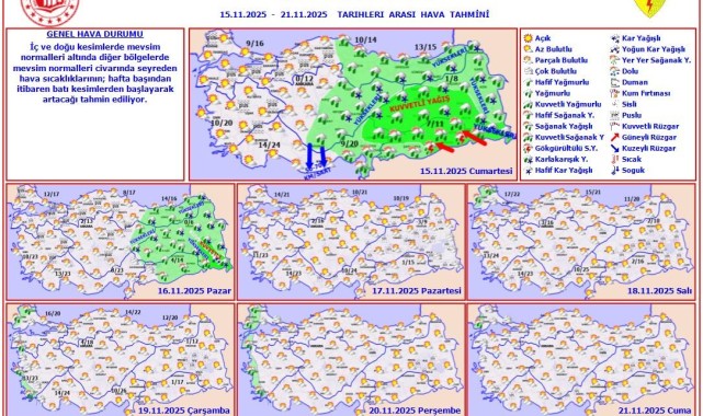 Meteoroloji Genel Müdürlüğü, 15-21 Kasım 2025 tarihleri arasını kapsayan haftalık hava tahminlerini yayınladı. Açıklamaya göre, Türkiye'nin iç ve doğu kesimlerinde mevsim normallerinin altında seyreden hava sıcaklıkları, diğer bölgelerde ise mevsim normalleri civarında olacak.Ancak, hafta başından itibaren batı bölgelerden başlayarak hava sıcaklıklarında artış bekleniyor. Bu artışın, özellikle batı kesimlerde etkili olacağı öngörülüyor.Yayınlanan verilere göre, hafta boyunca farklı bölgelerde yağış türleri ve yoğunlukları da değişiklik gösterecek. Yer yer puslu, az bulutlu ve parçalı bulutlu havalar beklenirken, bazı bölgelerde ise kuvvetli yağış uyarıları yapıldı.Editör: Haber MerkeziKaynak: Sosyal Medya