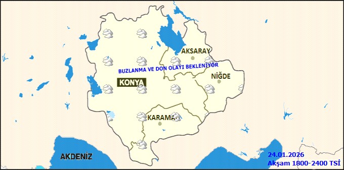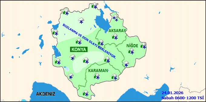 MGM Karaman Hava Durumu tarafından yapılan son duyuruya göre, 24 Ocak Cumartesi günü Karaman Merkez'de hava durumu parçalı ve çok bulutlu olacak. Gün boyunca aralıklı olarak yağmur, karla karışık yağmur ve yer yer kar yağışı bekleniyor.Merkez için en düşük sıcaklığın 1°C, en yüksek sıcaklığın ise 7°C civarında olması öngörülüyor. Özellikle sabah ve gece saatlerinde bölge genelinde yer yer buzlanma ve don olaylarının yanı sıra pus ve sis görülebileceği belirtildi.5 Günlük Tahmin ve Sıcaklık Verileri