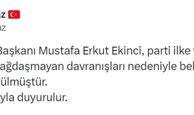 MHP Genel Başkan Yardımcısı ve Ankara Milletvekili Sadir Durmaz, "Sorgun Belediye Başkanı Mustafa Erkut Ekinci, parti ilke ve politikalarımızla bağdaşmayan davranışları nedeniyle belediye başkanları listemizden düşürülmüştür" dedi.MHP'li Durmaz, sosyal medya hesabından yaptığı açıklamada, "Sorgun Belediye Başkanı Mustafa Erkut Ekinci, parti ilke ve politikalarımızla bağdaşmayan davranışları nedeniyle belediye başkanları listemizden düşürülmüştür" ifadelerini kullandı.BAŞKAN EKİNCİ'DEN AÇIKLAMABelediye Başkanı Mustafa Erkut Ekinci de sosyal medya hesabından yaptığı açıklamada, "Son günlerde yaşanan talihsiz olayların partime, birlikte yol yürüdüğüm dava arkadaşlarıma zarar vermemesi adına mensubu olduğum MHP üyeliğimden istifa ediyorum" dedi.