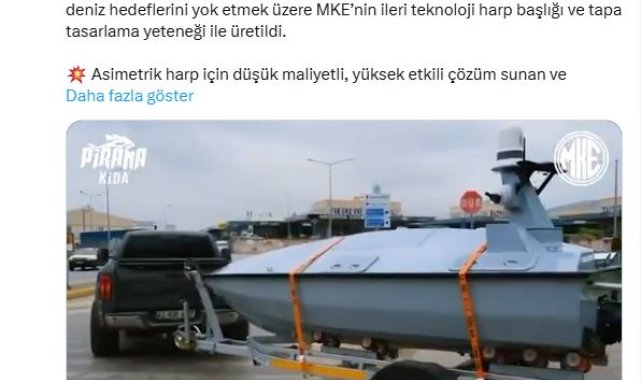 MAKİNE ve Kimya Endüstrisi A.Ş. (MKE), kamikaze insansız deniz aracı PİRANA KİDA'nın göreve hazır olduğunu duyurdu. MKE'nin sosyal medya hesabından yapılan açıklamada, "PİRANA KİDA göreve hazır. MKE kamikaze insansız deniz aracı PİRANA KİDA, tespit edilen düşman deniz hedeflerini yok etmek üzere MKE'nin ileri teknoloji harp başlığı ve tapa tasarlama yeteneği ile üretildi. Asimetrik harp için düşük maliyetli, yüksek etkili çözüm sunan ve otonom olarak ya da uzaktan operatör yönetimiyle hedefe çarpıp patlayan PİRANA KİDA; düşman gemilerine zarar verir, limanlara, üs bölgelerine sızar, donanma için etkili taarruz sağlar" denildi.