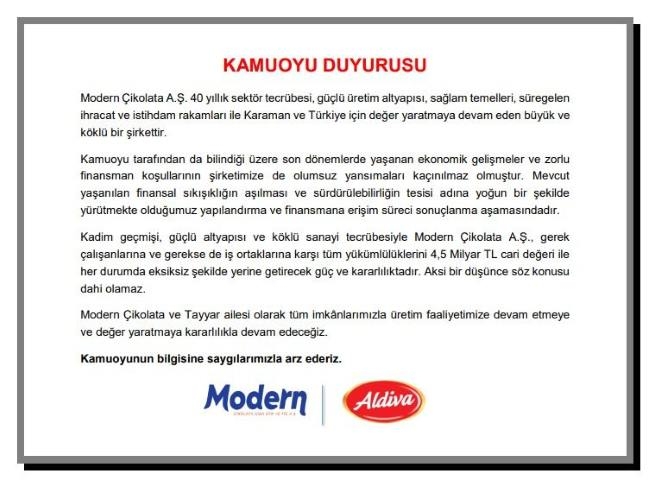 Modern Çikolata A.Ş. tarafından yapılan resmi açıklamada şu ifadelere yer verildi: