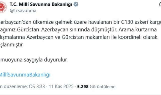Bakanlıktan yapılan yazılı açıklamada, "Azerbaycan'dan ülkemize gelmek üzere havalanan bir C130 askeri kargo uçağımız Gürcistan-Azerbaycan sınırında düşmüştür. Arama kurtarma çalışmalarına Azerbaycan ve Gürcistan makamları ile koordineli olarak başlanmıştır" denildi.