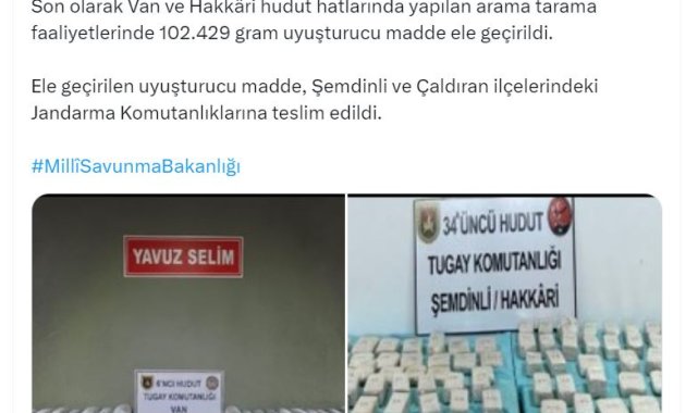 MİLLİ Savunma Bakanlığı (MSB), Van ve Hakkari hudut hatlarında yapılan arama tarama faaliyetlerinde 102 kilo 429 gram uyuşturucu madde ele geçirildiğini duyurdu.Bakanlığın sosyal medya hesabından yapılan açıklamada, "Hudut birliklerimiz; keşif, gözetleme ve devriye faaliyetlerini 7 gün 24 saat aralıksız sürdürüyor. Son olarak Van ve Hakkari hudut hatlarında yapılan arama tarama faaliyetlerinde 102 kilo 429 gram uyuşturucu madde ele geçirildi. Ele geçirilen uyuşturucu madde, Şemdinli ve Çaldıran ilçelerindeki Jandarma Komutanlıklarına teslim edildi" denildi.