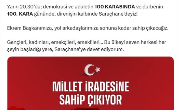 CHP Genel Başkanı Özgür Özel, "Bugünkü duruşmanın sonuç odaklı değil, partimizi tartıştırmaya, iktidar yürüyüşümüzü kesmeye, mücadele azmimizi kırmaya yönelik süreç odaklı bir siyasi operasyon olduğu ortadadır" dedi. Özel, CHP'nin 38'inci Olağan Kurultayı'nın iptali talepli davanın ertelenmesi ardından sosyal medya hesabından açıklama yaptı. Özel, "Partimize dönük hiçbir kumpas, 19 Mart darbesinden bağımsız değildir. Bugünkü duruşmanın da; sonuç odaklı değil, partimizi tartıştırmaya, iktidar yürüyüşümüzü kesmeye, mücadele azmimizi kırmaya yönelik süreç odaklı bir siyasi operasyon olduğu ortadadır. Asla hedeften şaşmayacağız, yolumuzdan dönmeyeceğiz. Yarın 20.30'da; demokrasi ve adaletin 100 karasında ve darbenin 100'üncü kara gününde, direnişin kalbinde Saraçhane'deyiz. Ekrem Başkanımıza, yol arkadaşlarımıza sonuna kadar sahip çıkacağız. Gençleri, kadınları, emekçileri, emeklileri, bu ülkeyi seven herkesi her şeyin başladığı yere, Saraçhane'ye davet ediyorum" ifadelerini kullandı.