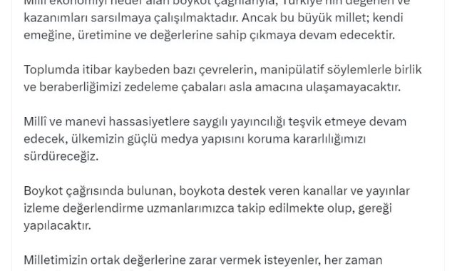 RADYO ve Televizyon Üst Kurulu (RTÜK) Başkanı Ebubekir Şahin, "Boykot çağrısında bulunan, boykota destek veren kanallar ve yayınlar izleme değerlendirme uzmanlarımızca takip edilmekte olup, gereği yapılacaktır" dedi.RTÜK Başkanı Şahin, sosyal medya hesabından yaptığı açıklamada, "Milli ekonomiyi hedef alan boykot çağrılarıyla, Türkiye'nin değerleri ve kazanımları sarsılmaya çalışılmaktadır. Ancak bu büyük millet; kendi emeğine, üretimine ve değerlerine sahip çıkmaya devam edecektir. Toplumda itibar kaybeden bazı çevrelerin, manipülatif söylemlerle birlik ve beraberliğimizi zedeleme çabaları asla amacına ulaşamayacaktır. Milli ve manevi hassasiyetlere saygılı yayıncılığı teşvik etmeye devam edecek, ülkemizin güçlü medya yapısını koruma kararlılığımızı sürdüreceğiz. Boykot çağrısında bulunan, boykota destek veren kanallar ve yayınlar izleme değerlendirme uzmanlarımızca takip edilmekte olup, gereği yapılacaktır. Milletimizin ortak değerlerine zarar vermek isteyenler, her zaman kaybetmeye mahkumdur" dedi.