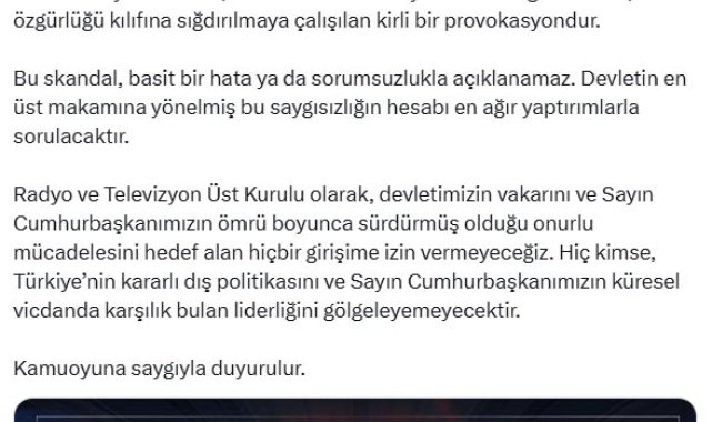 RADYO, Televizyon ve Üst Kurulu (RTÜK) Başkanı Ebubekir Şahin, "Gazze'de masum insanlara yönelik katliamların faili Netanyahu ile mazlumların hamisi ve insanlığın vicdanı olan Cumhurbaşkanımız Sayın Recep Tayyip Erdoğan'ı aynı alt yazıda yan yana getirmek; ahlaksızlık, hadsizlik ve Türkiye Cumhuriyeti Devleti'ne yapılmış açık bir saldırıdır. Devletin en üst makamına yönelmiş bu saygısızlığın hesabı en ağır yaptırımlarla sorulacaktır" dedi.RTÜK Başkanı Ebubekir Şahin, sosyal medyadan yaptığı açıklamada, "Gazze'de masum insanlara yönelik katliamların faili Netanyahu ile, mazlumların hamisi ve insanlığın vicdanı olan Cumhurbaşkanımız Sayın Recep Tayyip Erdoğan'ı aynı alt yazıda yan yana getirmek; ahlaksızlık, hadsizlik ve Türkiye Cumhuriyeti Devleti'ne yapılmış açık bir saldırıdır. Sayın Cumhurbaşkanımız, Gazze'de işlenen zulme karşı en güçlü sesi yükseltmiş, Filistin davasını her platformda kararlılıkla savunmuş bir liderdir. Böyle bir lideri, eli kanlı bir katille aynı zeminde göstermek; basın özgürlüğü kılıfına sığdırılmaya çalışılan kirli bir provokasyondur. Bu skandal, basit bir hata ya da sorumsuzlukla açıklanamaz. Devletin en üst makamına yönelmiş bu saygısızlığın hesabı en ağır yaptırımlarla sorulacaktır. Radyo ve Televizyon Üst Kurulu olarak, devletimizin vakarını ve Sayın Cumhurbaşkanımızın ömrü boyunca sürdürmüş olduğu onurlu mücadelesini hedef alan hiçbir girişime izin vermeyeceğiz. Hiç kimse, Türkiye'nin kararlı dış politikasını ve Sayın Cumhurbaşkanımızın küresel vicdanda karşılık bulan liderliğini gölgeleyemeyecektir" ifadeleri kullanıldı.