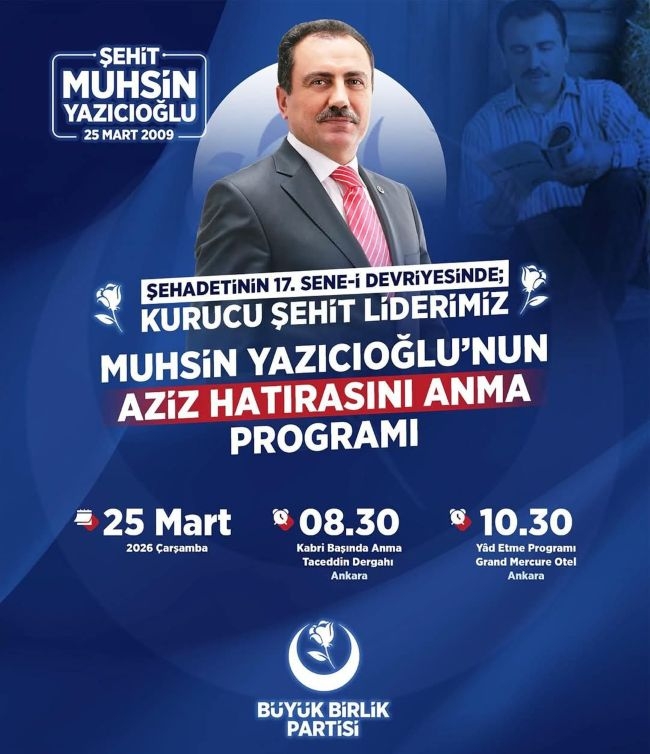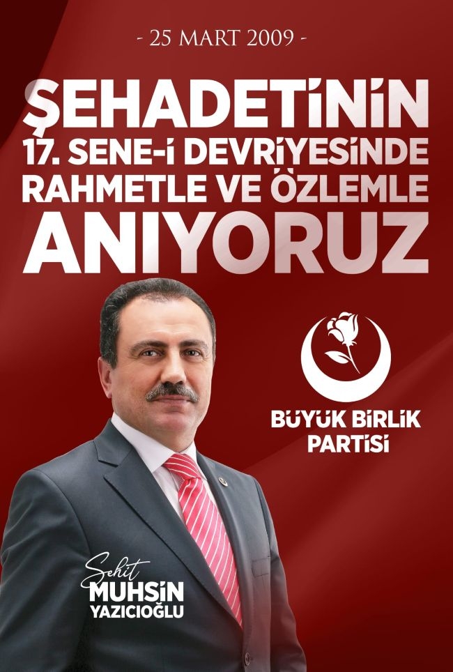 Bir süre önce yeniden BBP İl Başkanlığına getirilen Soyfidan mesajında, BBP’nin kurucu lideri Muhsin Yazıcıoğlu’nun hayatını milletine, vatanına ve mukaddes değerlere adadığını belirterek, onu rahmet, minnet ve dualarla andıklarını ifade etti.Mesut Soyfidan, açıklamasında şu ifadelere yer verdi:"Büyük Birlik davamızın kurucu Genel Başkanı, ömrünü milletine, vatanına ve mukaddes değerlerine adayan, dik duruşun ve inancın sembolü Muhsin Yazıcıoğlu’nu, şehadetinin 17. yıl dönümünde rahmet, minnet ve dualarla anıyoruz.Millet sevdasını her şeyin üzerinde tutan, “Ölümün de ötesi var” diyerek inandığı yolda yürüyen Şehit Liderimiz; hayatı boyunca doğruluktan, adaletten ve milli duruştan asla taviz vermemiştir.