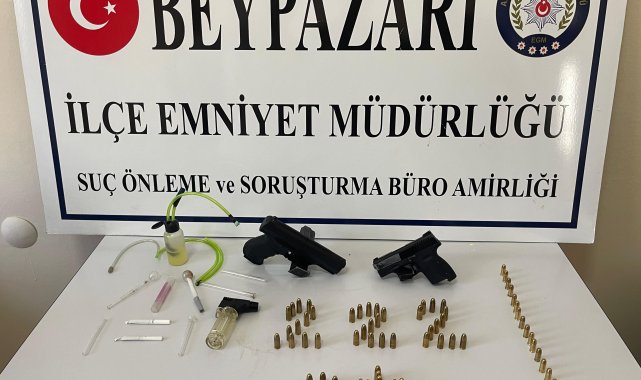 Muammer DAŞDELEN/BEYPAZARI (Ankara), (DHA)- ANKARA'nın Beypazarı ilçesinde durdurulan şüpheli araçta yapılan aramada, 2 ruhsatsız tabanca, çok sayıda mermi ve bir miktar uyuşturucu ele geçirildi, 1 şüpheli gözaltına alındı